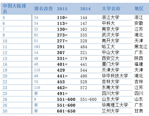 7所高校入選世界200強(qiáng)(浙江大學(xué)110、中科大113、南京大學(xué)130)。30所進(jìn)入全球前650,比去年新增三所(四川大學(xué)、華南理工、蘭州大學(xué)),分布大陸15個(gè)省和直轄市。