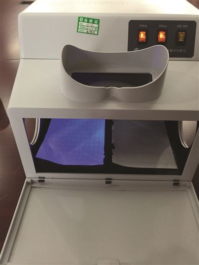 添加了熒光增白劑的作業(yè)本在紫外分析儀中發(fā)出藍熒熒的光。