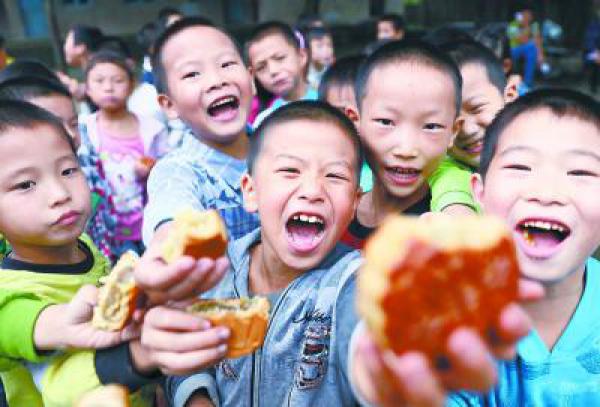 9月22日,留守兒童開心地品嘗剛領(lǐng)到的“愛心月餅”。當(dāng)日,四川省華鎣市國家稅務(wù)局的愛心人士帶著月餅和關(guān)愛之情,來到偏遠(yuǎn)的溪口鎮(zhèn)順天寨村小,看望學(xué)習(xí)生活在大山深處的42名留守兒童,與孩子們一起開展“品月餅,話中秋”活動,迎接即將來臨的中秋節(jié)。