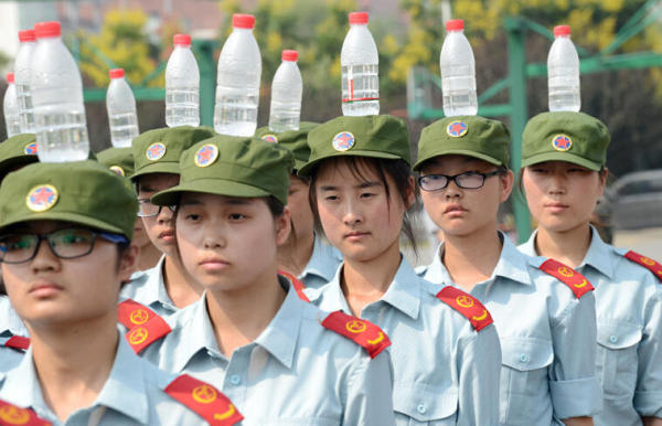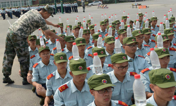 2015年9月17日,河南鄭州一學(xué)院的新生在頭頂?shù)V泉水瓶進(jìn)行軍訓(xùn)。