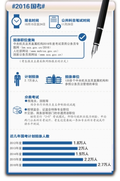 昨天,中組部、人社部和國家公務(wù)員局發(fā)布消息稱,2016年度中央機關(guān)及其直屬機構(gòu)考試錄用公務(wù)員明天起開始報名,公共科目筆試定于11月29日舉行。這次招錄共有120多個中央機關(guān)及其直屬機構(gòu)和參照公務(wù)員法管理的單位參加,計劃招錄2.7萬余人,同比擴招約5000人。中公教育和華圖教育公考專家則透露,由于近十年來國考招錄人數(shù)一直未超越2.5萬人,這意味著這次的招錄人數(shù)再次刷新了去年創(chuàng)下的歷史最高值。