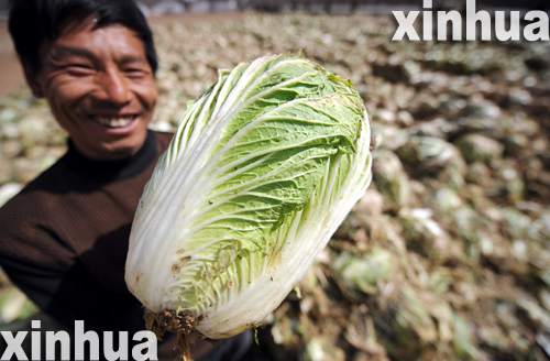2月28日,甘肅省成縣索池鄉(xiāng)大川村農(nóng)民在展示剛剛收割的大白菜。