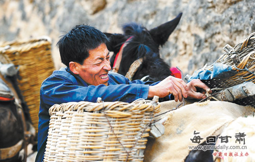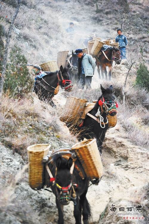 7時30分,在7條漢子的吆喝聲中,12頭騾子排著整齊的隊形,沿著山路往山上行進。馱隊隊長王守信說:“我加入馱隊10年了,參加過成縣黃渚礦山、蘭州、岷縣、張掖、平?jīng)、靖遠的馱運任務(wù),我們常年在外,馱隊規(guī)模最大時有120頭騾子,每年基本上從正月十二就開工,最遲臘月二十收工。我們攬的活主要在山西、陜西兩地。那次在山西干了半個月,騾子走了一天兩夜。”