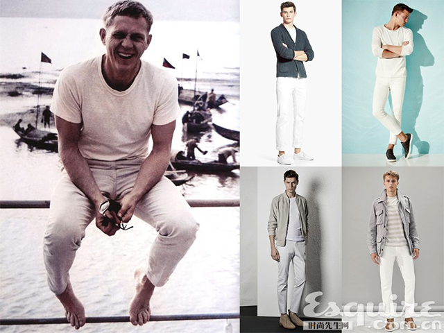 白色真是一個(gè)很討喜的顏色,而且?guī)缀鯖](méi)有人穿上白色會(huì)不好看!當(dāng)然在熒幕上和私服把一身白色穿出名的當(dāng)屬Steve McQueen!皌he King of Cool”的頭銜不是虛的,有太多代表他風(fēng)格的服裝,包括皮夾克、賽車(chē)服、卡其褲等等,但是是他把白色T恤×白色牛仔褲穿出利落又硬漢的風(fēng)格,上世紀(jì)60、70年代的照片放今天看一點(diǎn)也不過(guò)時(shí)。