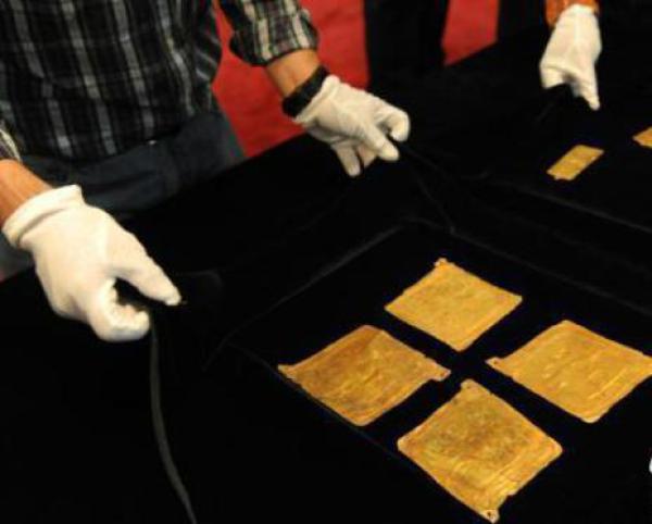 圖為法國(guó)收藏家克里斯蒂安·戴迪安返還中國(guó)的24件禮縣大堡子山秦公墓地出土金飾片。