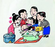 永軍和媳婦是高中同學(xué),媳婦是他們班里最好看的姑娘,性格也特別好。當(dāng)時(shí),永軍就在心里默默放下狠話,將來(lái)一定要讓她出現(xiàn)在自己筆下的全家福中。就這樣,經(jīng)歷了八年愛(ài)情長(zhǎng)跑的他們幸福地步入了婚姻的殿堂。從民政局領(lǐng)證回來(lái)后,激動(dòng)的永軍將每年春節(jié)的傳統(tǒng)項(xiàng)目畫全家福提前了,連夜就奮筆疾書畫了起來(lái)。那張全家福里,披著大紅花的他背著漂亮的媳婦,笑得格外燦爛,而爸媽和弟弟則化身威風(fēng)鑼鼓隊(duì)成員,又是敲鑼又是打鼓,好不熱鬧。