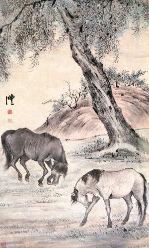 錢灃作品《柳下雙駿》