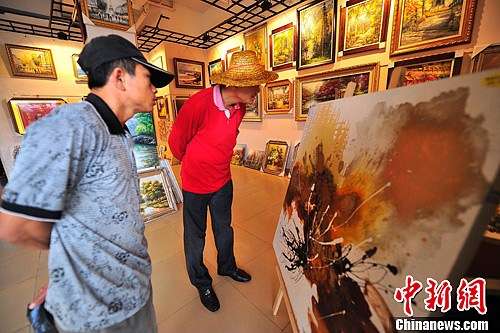 圖為兩位農(nóng)民兄弟在一幅油畫(huà)前駐足欣賞。中新社發(fā) 駱云飛 攝