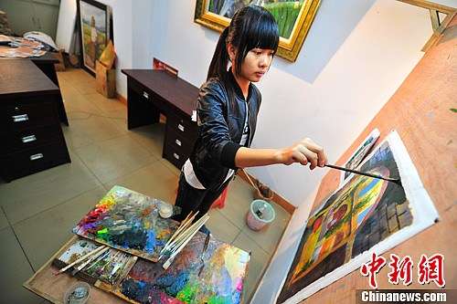 圖為一位年輕的農(nóng)民畫(huà)師正在作畫(huà)。中新社發(fā) 駱云飛 攝