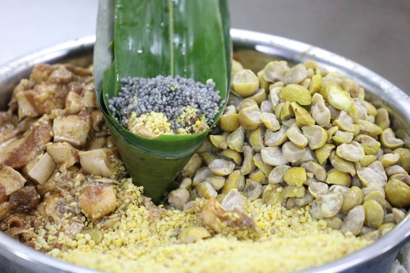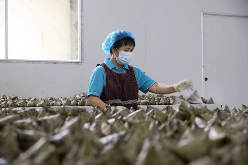 工人們?cè)谲囬g里包粽子。龔普康攝
