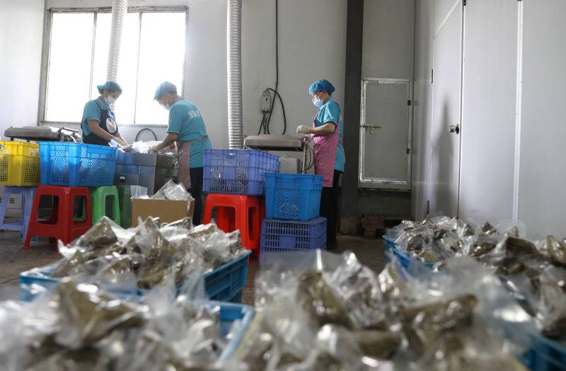 工人們?cè)谲囬g內(nèi)將粽子進(jìn)行真空包裝。龔普康攝