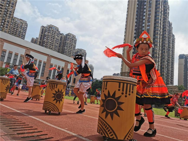 學(xué)生們正在表演白褲瑤猴鼓舞。ㄑ霃V網(wǎng)發(fā) 唐澤龍攝)