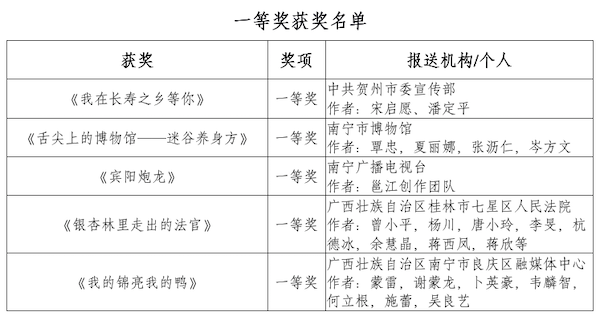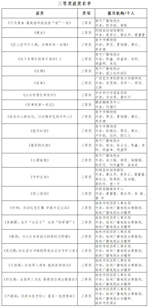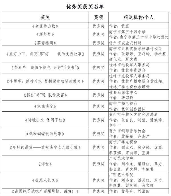 國際在線廣西頻道消息:2020“講好中國故事”創(chuàng)意傳播大賽廣西分站賽自2020年8月啟動(dòng)以來,共征集作品近百部。所有參賽作品經(jīng)專家評委評審及廣西壯族自治區(qū)黨委宣傳部審核確認(rèn),最終評選出一等獎(jiǎng)5名、二等獎(jiǎng)10名、三等獎(jiǎng)21名、優(yōu)秀獎(jiǎng)若干。獲獎(jiǎng)名單經(jīng)公示、確認(rèn),現(xiàn)進(jìn)行公布。至此,2020“講好中國故事”創(chuàng)意傳播大賽廣西分站賽圓滿結(jié)束。(文 陸穎丹)