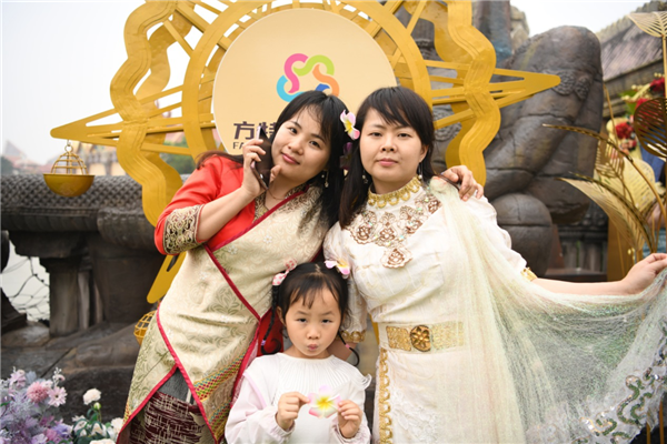 游客身穿特色服飾合影(央廣網(wǎng)發(fā) 南寧方特東盟神畫(huà)主題樂(lè)園供圖)