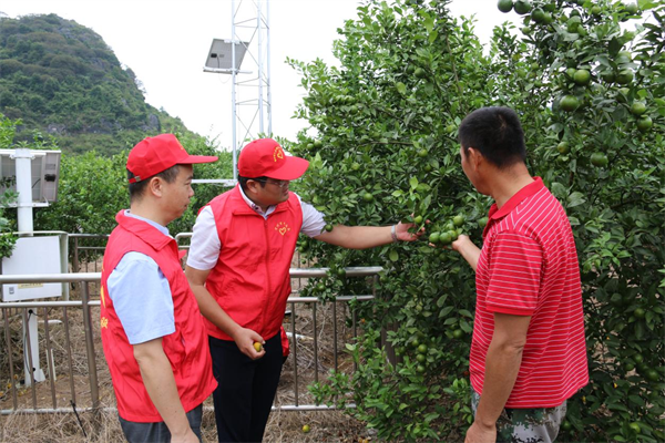 服務(wù)隊(duì)員到鐘山縣同古鎮(zhèn)幸福沖貢柑示范區(qū)開(kāi)展特色農(nóng)產(chǎn)品氣象志愿服務(wù)需求調(diào)研(央廣網(wǎng)發(fā) 蘇汝琦攝)