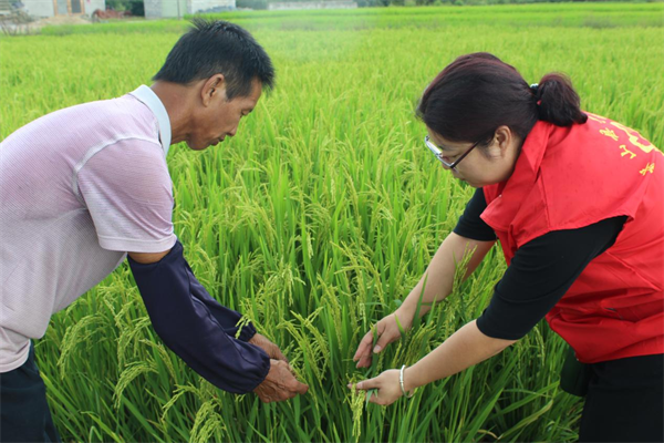 服務(wù)隊(duì)員到鐘山縣鳳翔鎮(zhèn)同枝村開(kāi)展晚稻寒露風(fēng)氣象服務(wù)(央廣網(wǎng)發(fā) 歐陽(yáng)露瓊攝)