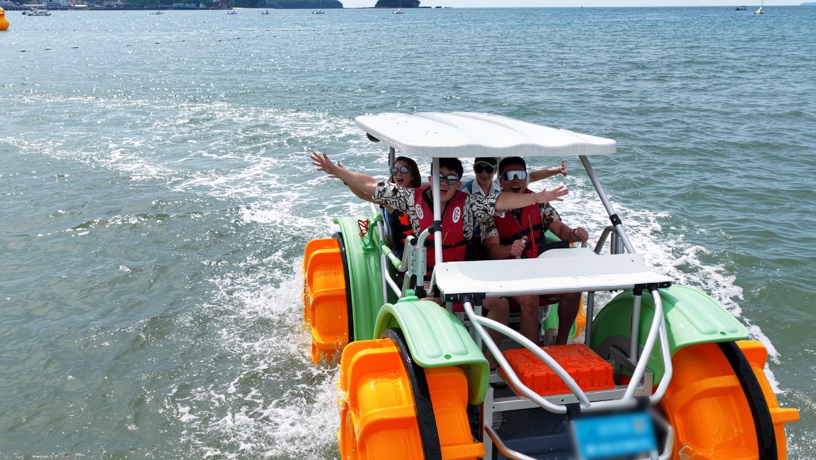 在潿洲島的海邊,游客在體驗水陸兩棲車(央廣網發(fā) 潿洲島旅游區(qū)管理委員會供圖)