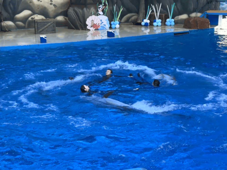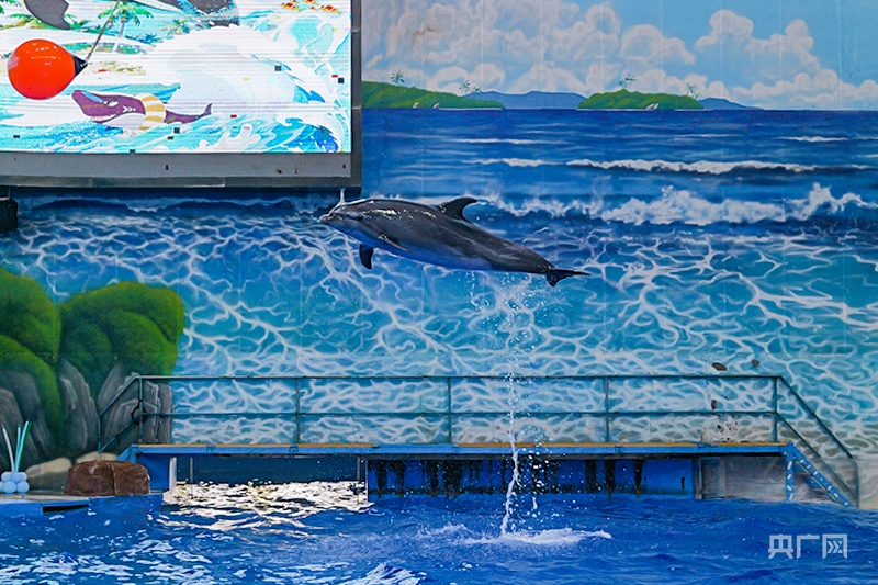 碧藍的水池中,海豚與工作人員默契地旋轉(zhuǎn)共舞(央廣網(wǎng)記者 梁瑜琳 制圖)