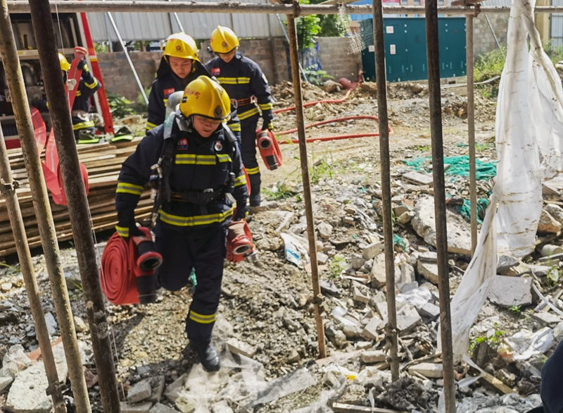 現場指揮員通過無人機實時畫面?zhèn)鬏、詢問知情人、深入內部偵察、外部觀察等方法了解情況后,發(fā)現登高平臺車無法展開,指揮員隨即下達作戰(zhàn)命令,戰(zhàn)斗小組采取沿防煙樓梯蜿蜒鋪設水帶的方式登高,在著火層下一層設置進攻起點,并設置安全員,對進攻人員進行登記管控并評估內攻風險。現場安全員評估風險可控,戰(zhàn)斗小組用水槍的掩護搜救組進入事故區(qū)域搜救被困傷者并轉移至安全區(qū)域,同時在進攻起點層設置緊急救助小組,隨時做好緊急救助準備及適時與內攻人員輪換。