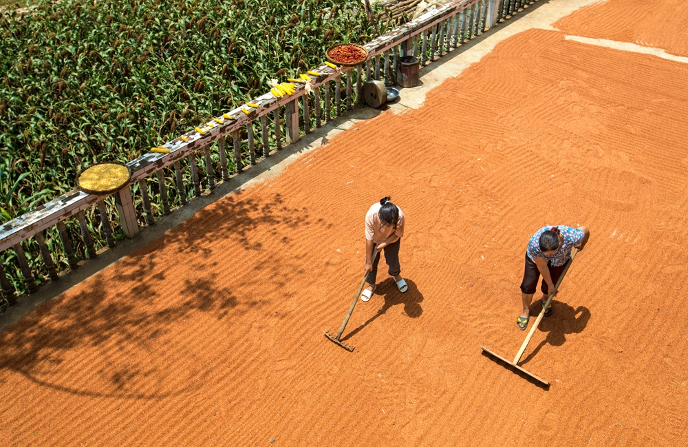 2021年8月20日,貴州省黔西市定新彝族苗族鄉(xiāng)馬驂村,村民晾曬收割的高粱。(央廣網(wǎng)發(fā) 史開心攝)