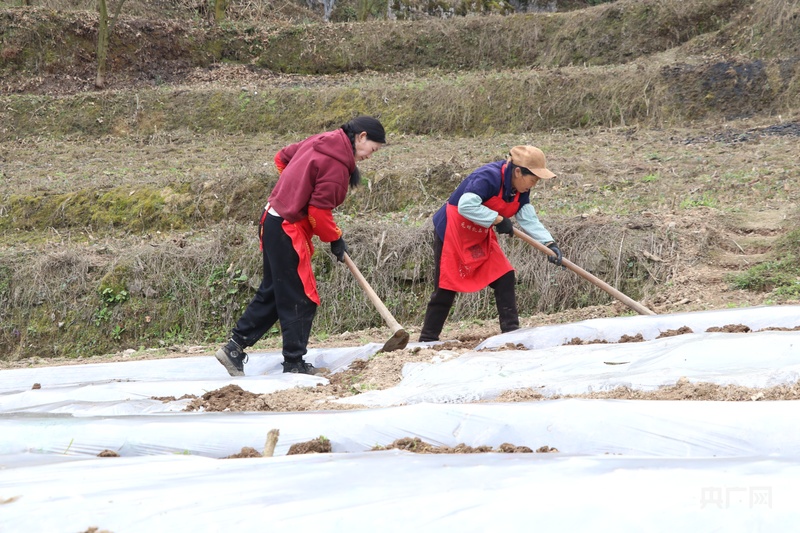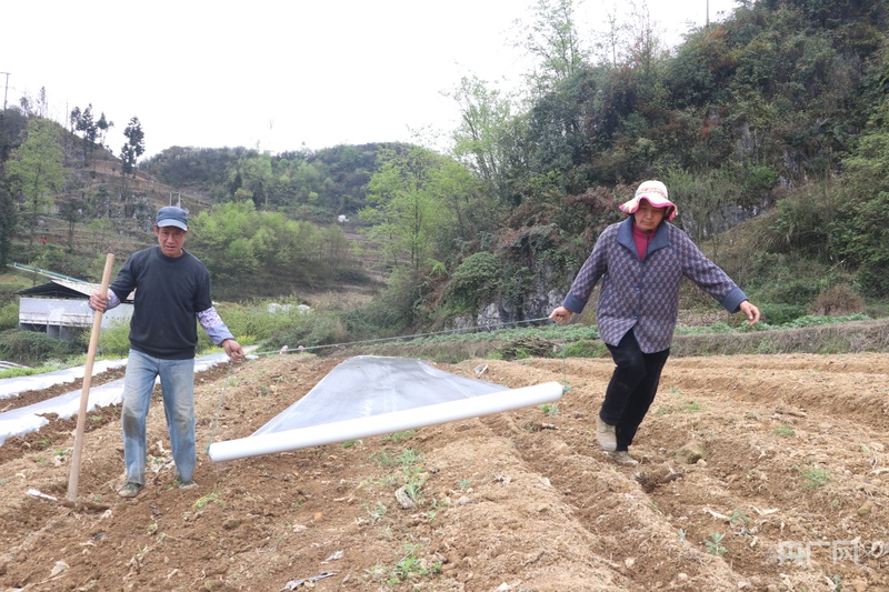 七星關(guān)區(qū)林口鎮(zhèn)大寨村辣椒種植基地,工人在起壟覆膜(央廣網(wǎng)發(fā) 邱雪 攝)