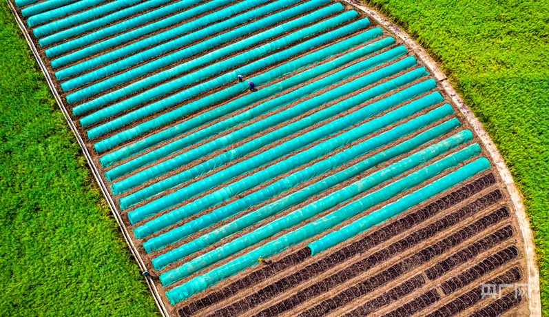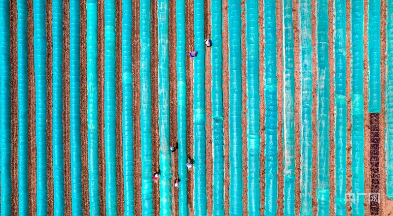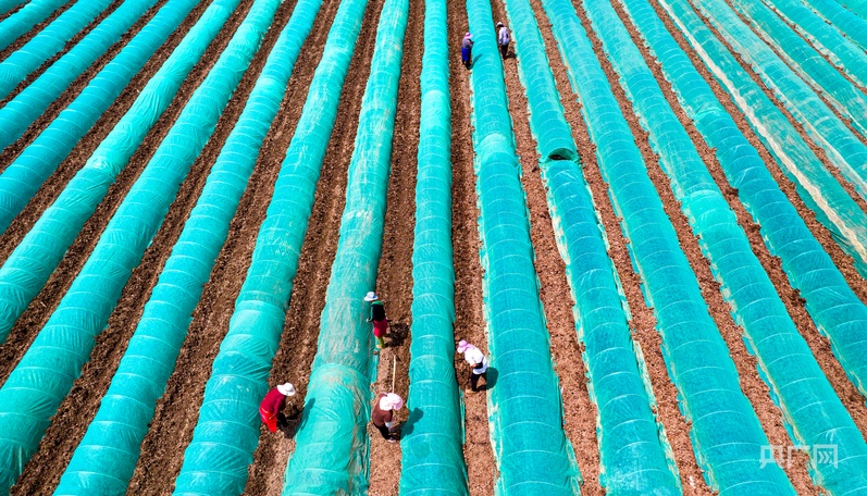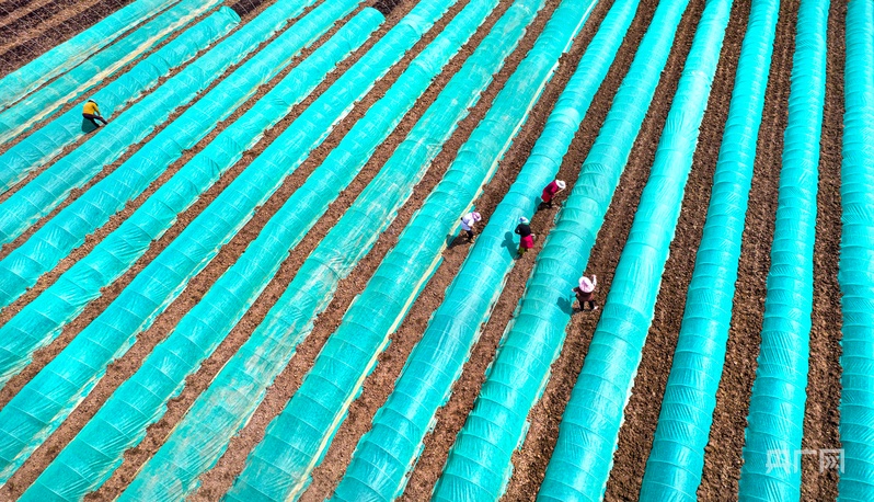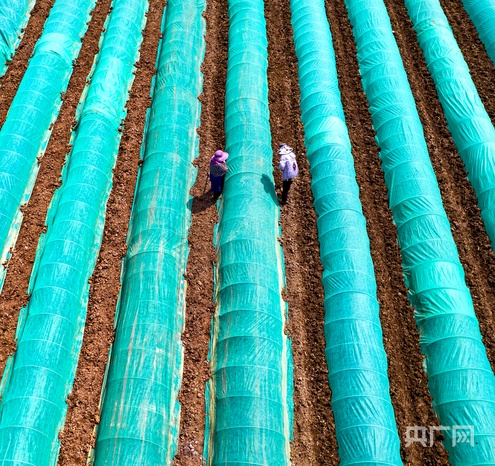 4月11日,在黔西市金碧鎮(zhèn)鏵口寨社區(qū)田間,村民為剛播下的稻谷種覆膜(央廣網(wǎng)發(fā) 史開心 攝)