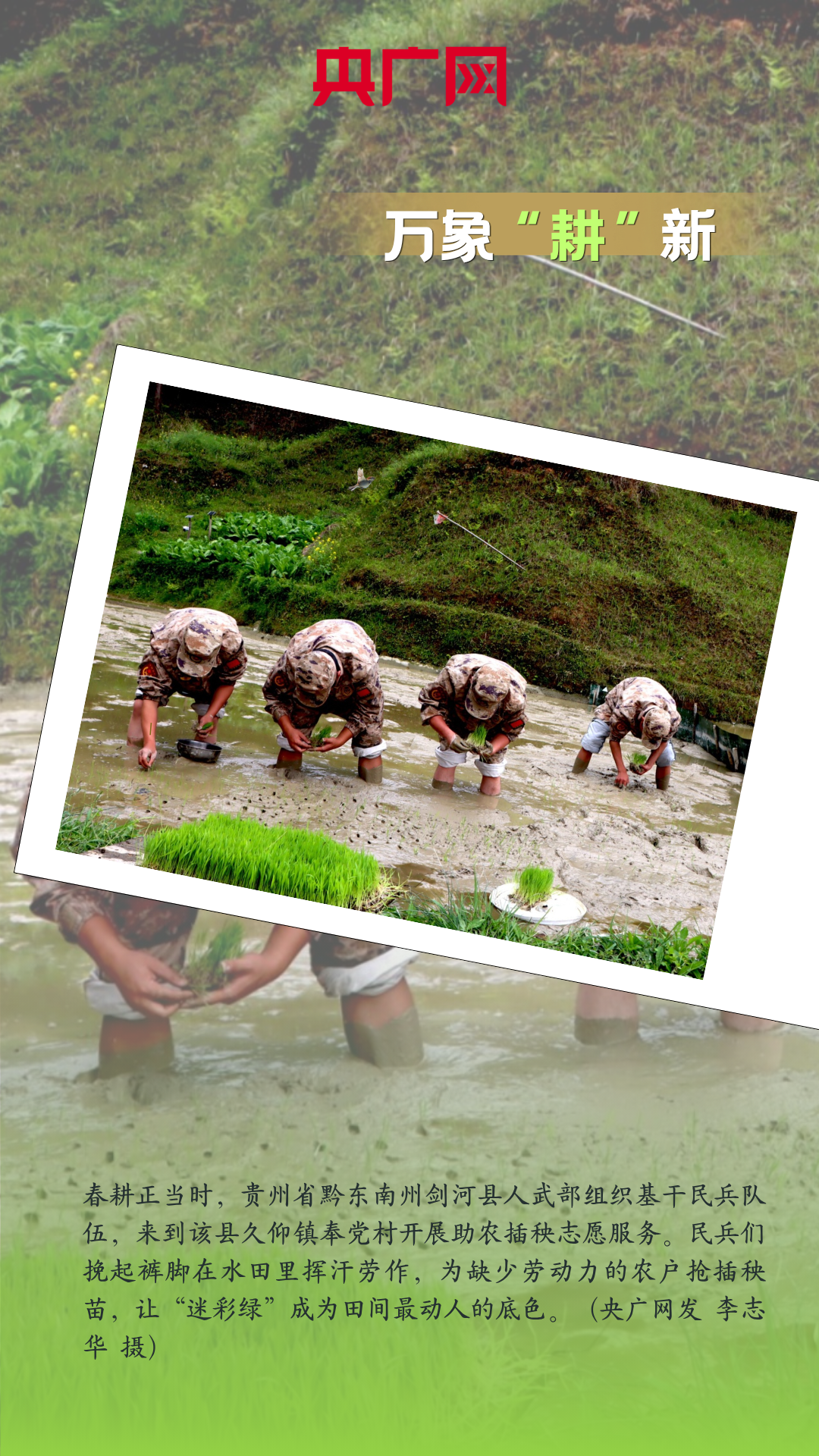 春耕啟,萬(wàn)物興。貴州山野沃野間,一幅生機(jī)盎然的春日農(nóng)耕畫(huà)卷正徐徐鋪展。從智能化育秧到無(wú)人機(jī)田間作業(yè),從農(nóng)技專(zhuān)家深入一線指導(dǎo),到民兵隊(duì)伍助力插秧助耕……各地?fù)屪マr(nóng)時(shí)、多措并舉,智慧與汗水在田間交織,科技與人力在沃野共舞。