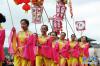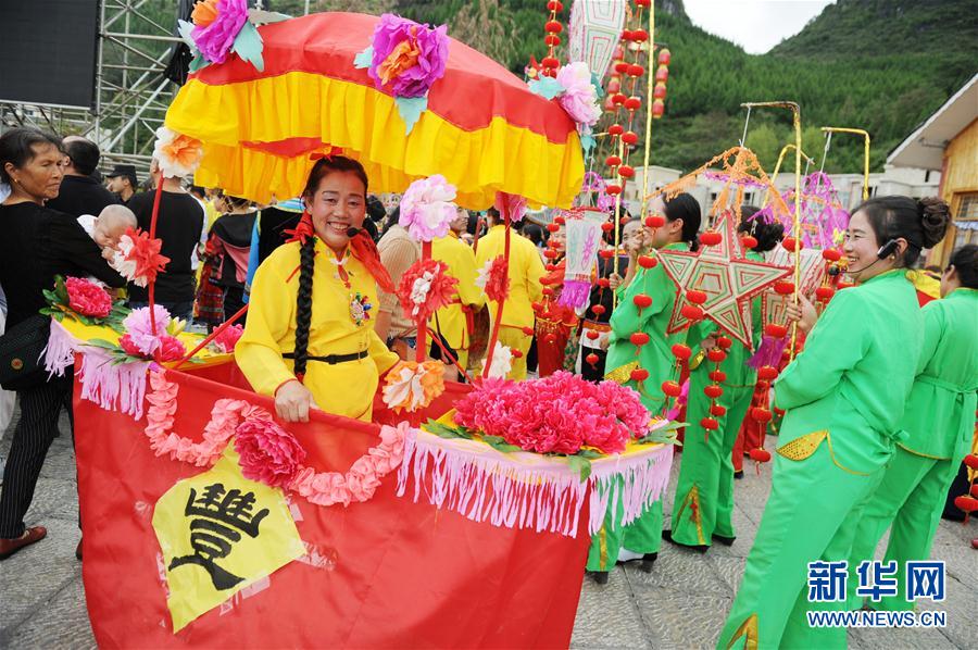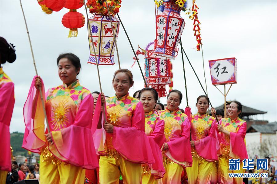 9月23日,農(nóng)民在貴州省岑鞏縣水尾鎮(zhèn)馬家寨村跳花燈。當(dāng)日,貴州省黔東南苗族侗族自治州岑鞏縣水尾鎮(zhèn)馬家寨村舉辦首屆中國農(nóng)民豐收節(jié)慶祝活動,當(dāng)?shù)剞r(nóng)民通過跳花燈、舞金錢棍、展儺戲儺技等民俗表演歡度節(jié)日。新華社發(fā)(楊文斌 攝)