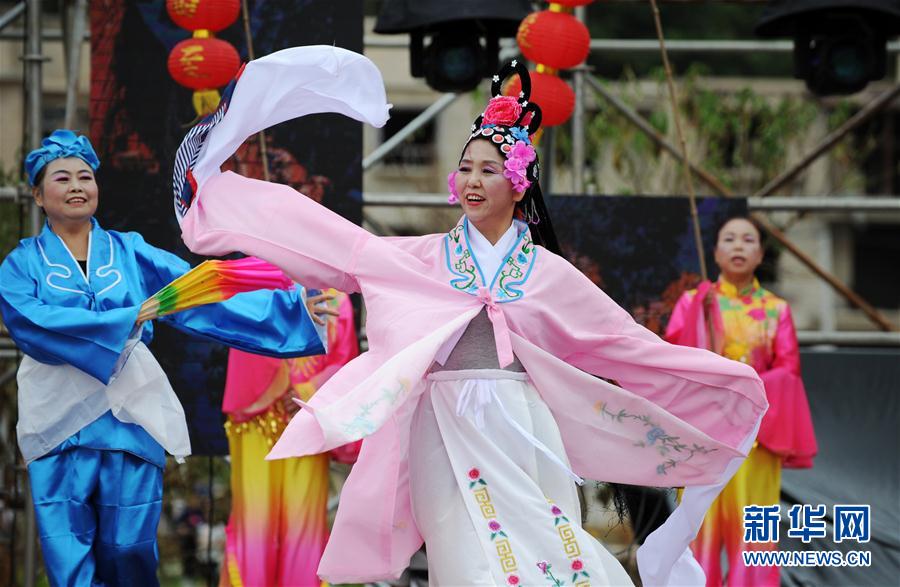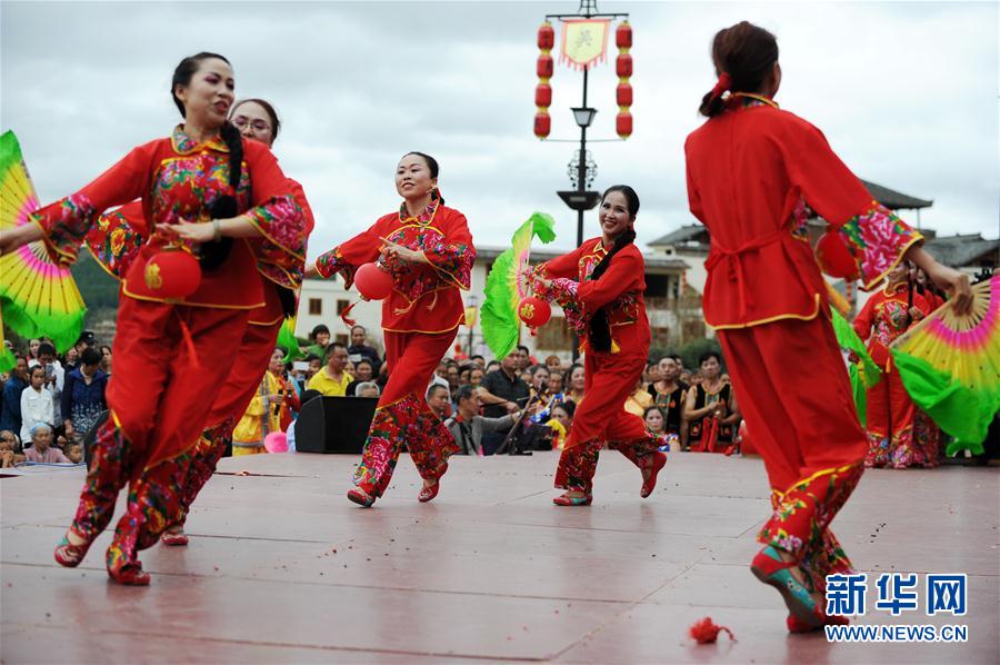9月23日,農(nóng)民在貴州省岑鞏縣水尾鎮(zhèn)馬家寨村跳花燈。當(dāng)日,貴州省黔東南苗族侗族自治州岑鞏縣水尾鎮(zhèn)馬家寨村舉辦首屆中國農(nóng)民豐收節(jié)慶祝活動,當(dāng)?shù)剞r(nóng)民通過跳花燈、舞金錢棍、展儺戲儺技等民俗表演歡度節(jié)日。新華社發(fā)(楊文斌 攝) -