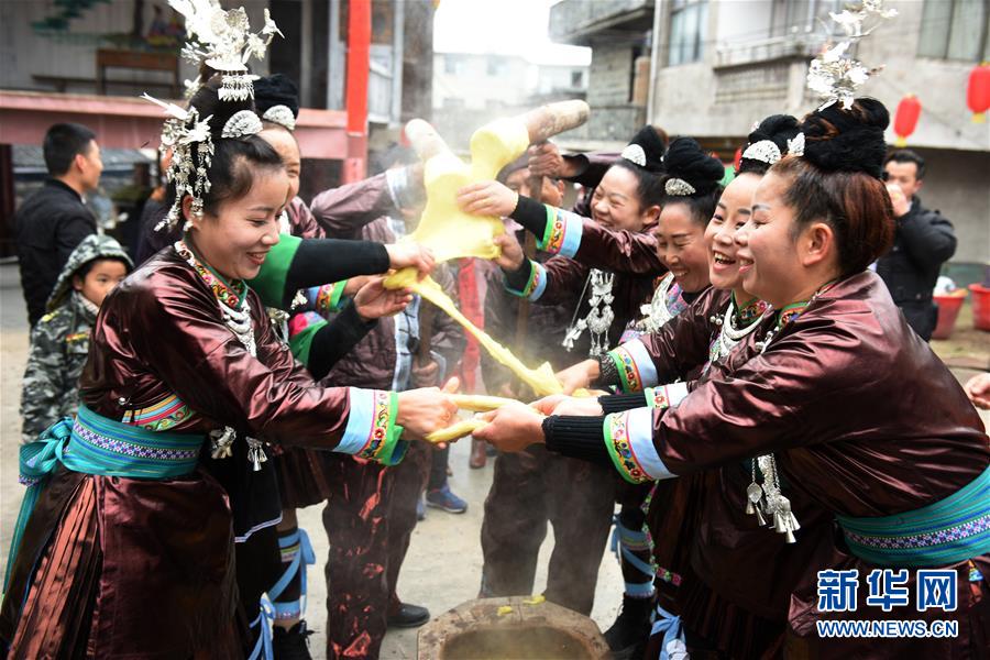 12月9日,貴州省黎平縣中潮鎮(zhèn)佳所侗寨的村民在打糍粑歡度侗年。12月7日至9日,貴州省黔東南苗族侗族自治州黎平縣肇興、佳所等侗寨的侗族同胞身著節(jié)日盛裝,與賓朋歡聚一堂,通過盛裝巡游、鼓樓對歌、侗戲展演、舞龍、打年粑等特色民俗活動,歡度侗年。新華社發(fā)(楊文斌 攝)