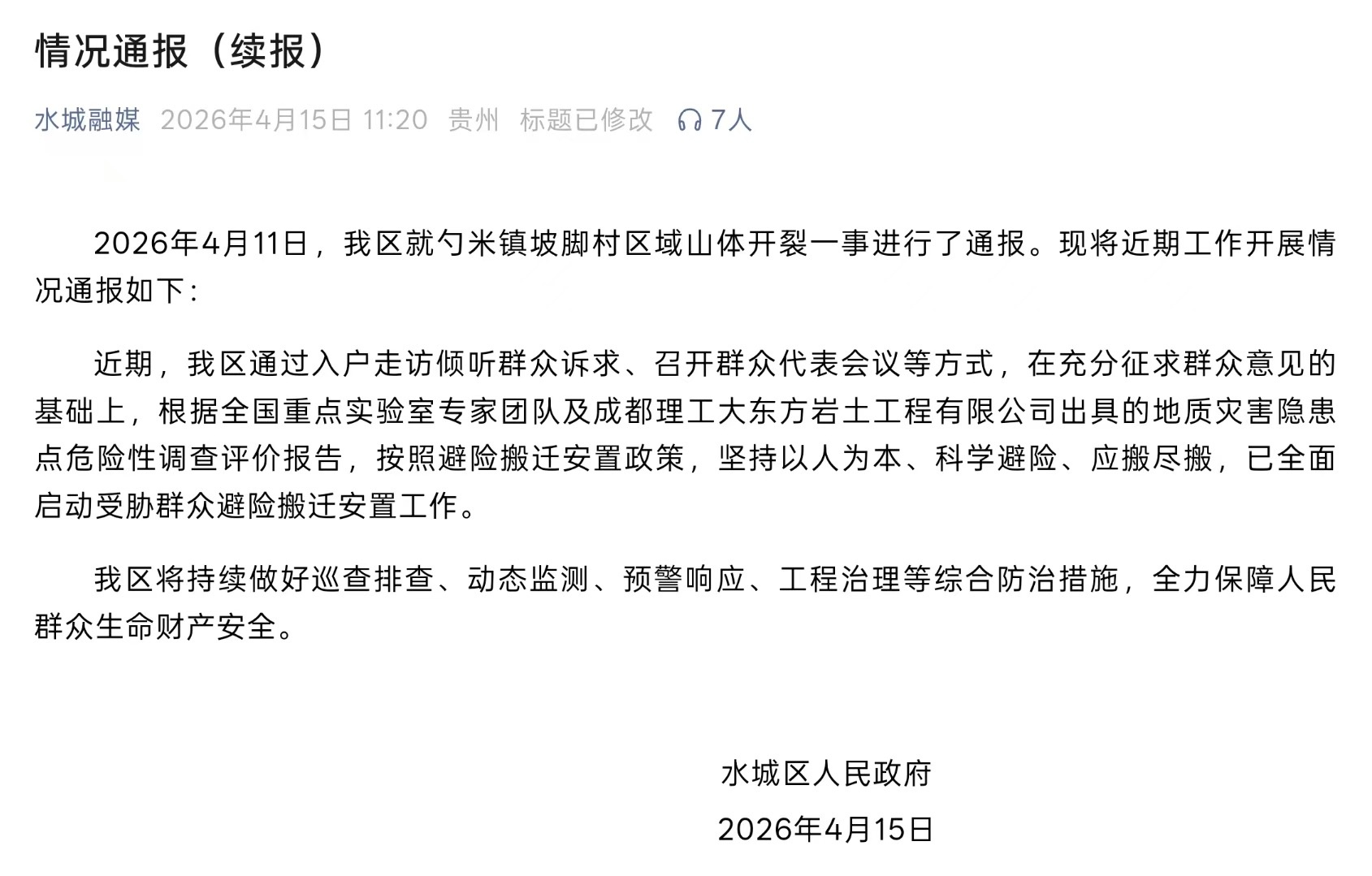 2026年4月11日,我區(qū)就勺米鎮(zhèn)坡腳村區(qū)域山體開(kāi)裂一事進(jìn)行了通報(bào)。現(xiàn)將近期工作開(kāi)展情況通報(bào)如下: