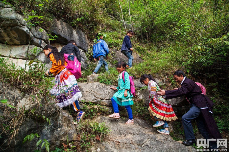 在貴州省黔西縣金蘭鎮(zhèn)瓦房村,有一座懸掛在800米峭崖上的哈沖苗寨,在懸崖下的鴨池河是阻隔了他們和外界的交流。一江之隔,天壤之別。為了孩子們外出求學(xué),苗寨里唯一的教書先生楊紹書,帶領(lǐng)苗家人開辟出了一條“天路”,直達(dá)位于崖頂?shù)拇遄永锏膶W(xué)校。幾十年間,楊紹書在這條崎嶇的山路上往返近4萬公里,護(hù)送自己寨子里200多個孩子上學(xué),一直把他們送出了大山。