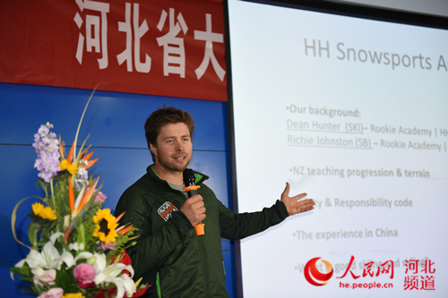 圖為新西蘭滑雪指導員培訓學院創(chuàng)始人、院長Dean Hunter介紹新西蘭大眾滑雪標準。張夢琪 攝
