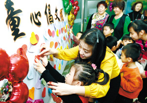 圖為孩子們和家長將“文明禮儀”宣傳卡張貼在社區(qū)文明墻上。