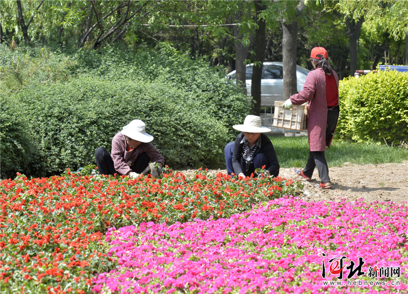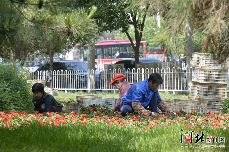 4月24日,在石家莊市裕華東路南側(cè)的草坪中,園林工人正在種植花卉。 為迎接“五一”國際勞動節(jié),石家莊市在市內(nèi)主要干道兩側(cè)種植了274萬盆花卉,并在裕華路兩側(cè)設(shè)置了13組立體花壇、3組藝術(shù)花墻,打造城市園林景觀。 -