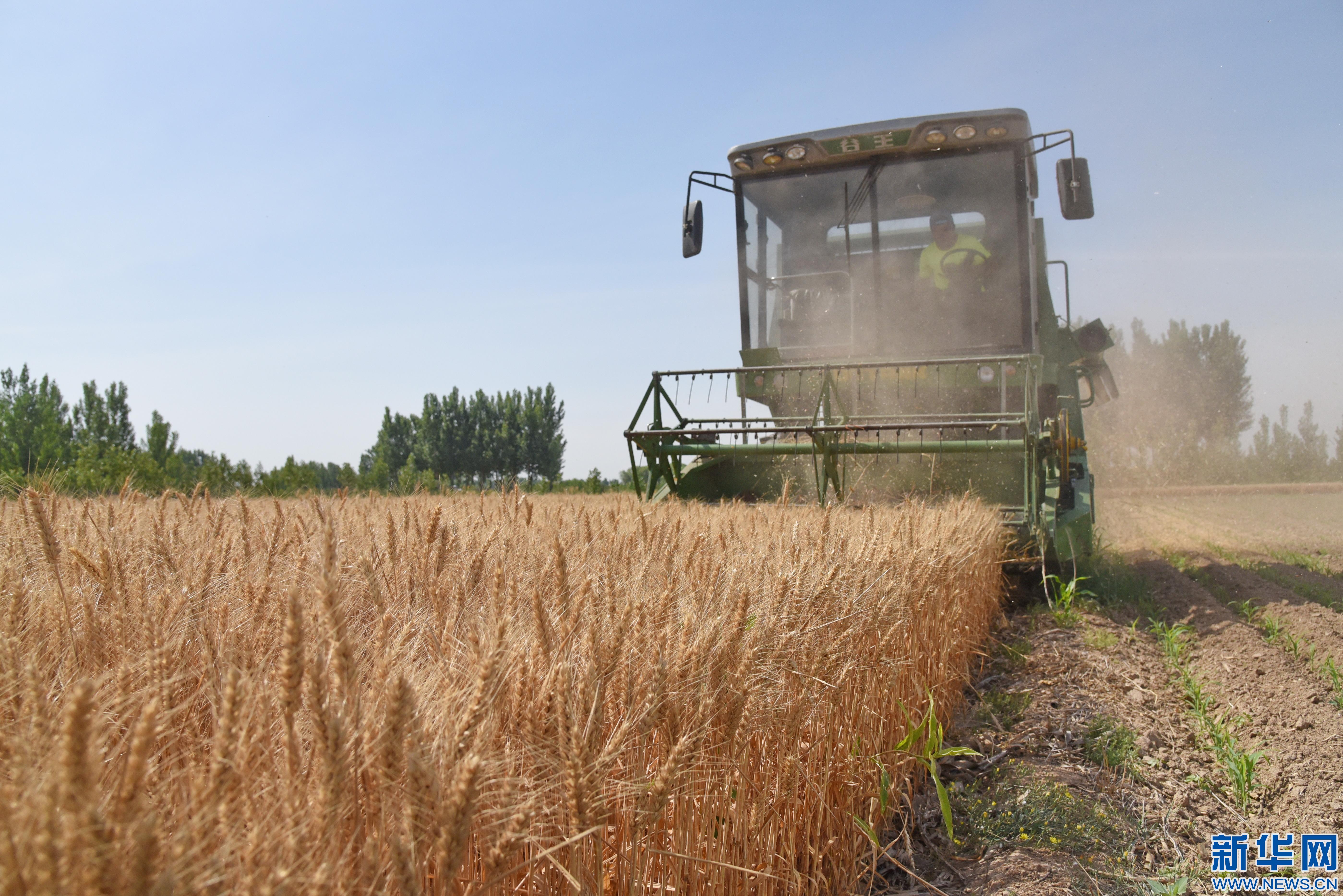 6月4日,一臺(tái)聯(lián)合收割機(jī)在河北省河間市北豐爾莊村麥田進(jìn)行收割作業(yè)。新華社記者朱旭東 攝