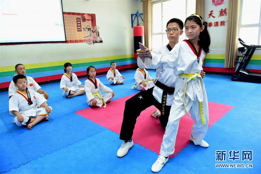 7月5日,在河北省新樂市青少年活動(dòng)中心,孩子們參加跆拳道興趣班。暑假來臨,河北省新樂市的不少小朋友來到該市青少年活動(dòng)中心,學(xué)習(xí)舞蹈、航模、書法、繪畫、跆拳道等,快樂過假期。 新華社發(fā)(賈敏杰 攝) -