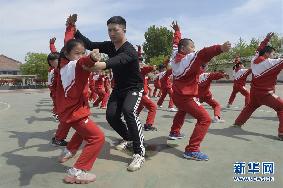 4月24日,三河市山下莊小學(xué)的武術(shù)教練(前左)對學(xué)生進(jìn)行指導(dǎo)。自2017年起,河北省三河市山下莊小學(xué)將傳統(tǒng)武術(shù)引進(jìn)校園,開設(shè)武術(shù)課程,讓學(xué)生們在強(qiáng)身健體的同時(shí),傳承武術(shù)精神,弘揚(yáng)傳統(tǒng)文化。新華社記者魯鵬攝