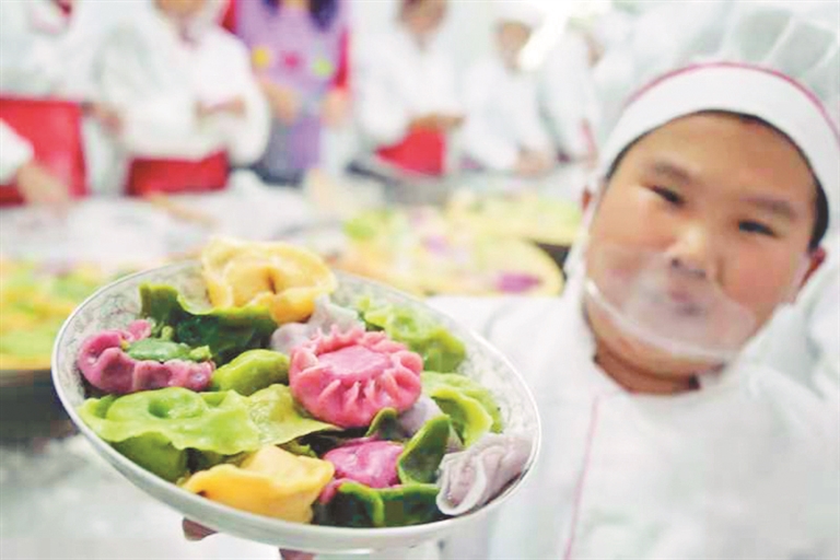 鍋勺桶盆叮當(dāng)響,煎炸烹炒好不熱鬧。在配菜間,眼前十幾個(gè)頭頂廚師帽的“小豆包”吸引了記者的目光!翱腿撕茫∵@是我包的餃子,韭菜鮮肉的,這是我們一起做的蛋黃玉米壽司,您來(lái)塊嘗嘗。”三年級(jí)學(xué)生梓萱自豪地告訴記者,麻醬拉皮、番茄魚(yú)、西紅柿炒蛋是他的拿手菜,他已成為家里的“小廚神”。