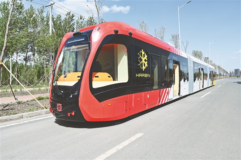 在哈爾濱新區(qū)江北一體發(fā)展區(qū)世茂大道西端路邊,一輛以紅、黃為主色調(diào)的列車分外搶眼。這就是于2020年12月26日運抵新區(qū)的兩臺智軌電車中的一臺。