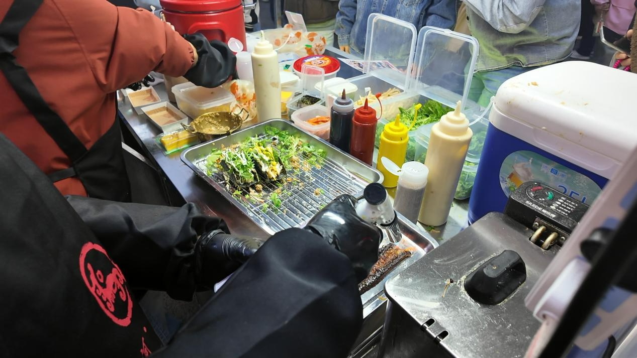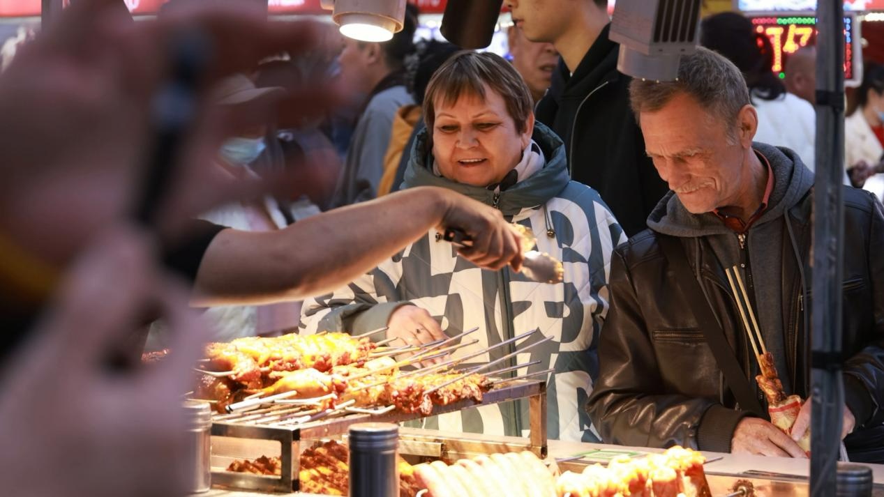 精致新穎的創(chuàng)意壽司、鮮香火辣的烈火牛肉、外酥里嫩的土耳其烤餅,各色美食香氣四溢、誘人味蕾。攤主們熱情吆喝、熟練烹制,香氣彌漫整條街區(qū),吸引眾多中外游客駐足品嘗、拍照打卡!斑@里的美食我們都很喜歡,尤其愛吃烤魷魚。每年都想來嘗遍各種特色小吃、欣賞不一樣的風(fēng)景!倍砹_斯游客阿麗娜說!敖裉煲故刑鸨耍稚先嵌砹_斯游客,開市僅一小時,大串就賣出五六十串!鄙特湺碰我贿吙敬,一邊介紹。