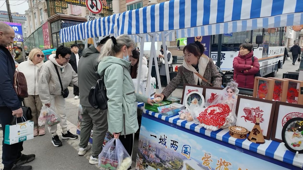 除了香氣撲鼻的美食,輕工文創(chuàng)區(qū)同樣人氣滿滿。俄羅斯套娃、樺樹皮工藝品、DIY創(chuàng)意擺件等中俄特色商品琳瑯滿目,市民游客駐足挑選,處處彰顯蓬勃的消費活力。俄羅斯游客卡佳展示著她手中的手工吊墜:“夜市,這個創(chuàng)意太棒了,聚集了這么多人,對商戶和游客都十分友好。這里種類豐富,好吃又有趣,很多美食在俄羅斯品嘗不到。每年都想來,逛得特別開心!焙团笥岩黄饋泶蚩ǖ氖v瓮瑯狱c贊:“大家早就盼著夜市開市,體驗感特別好。”