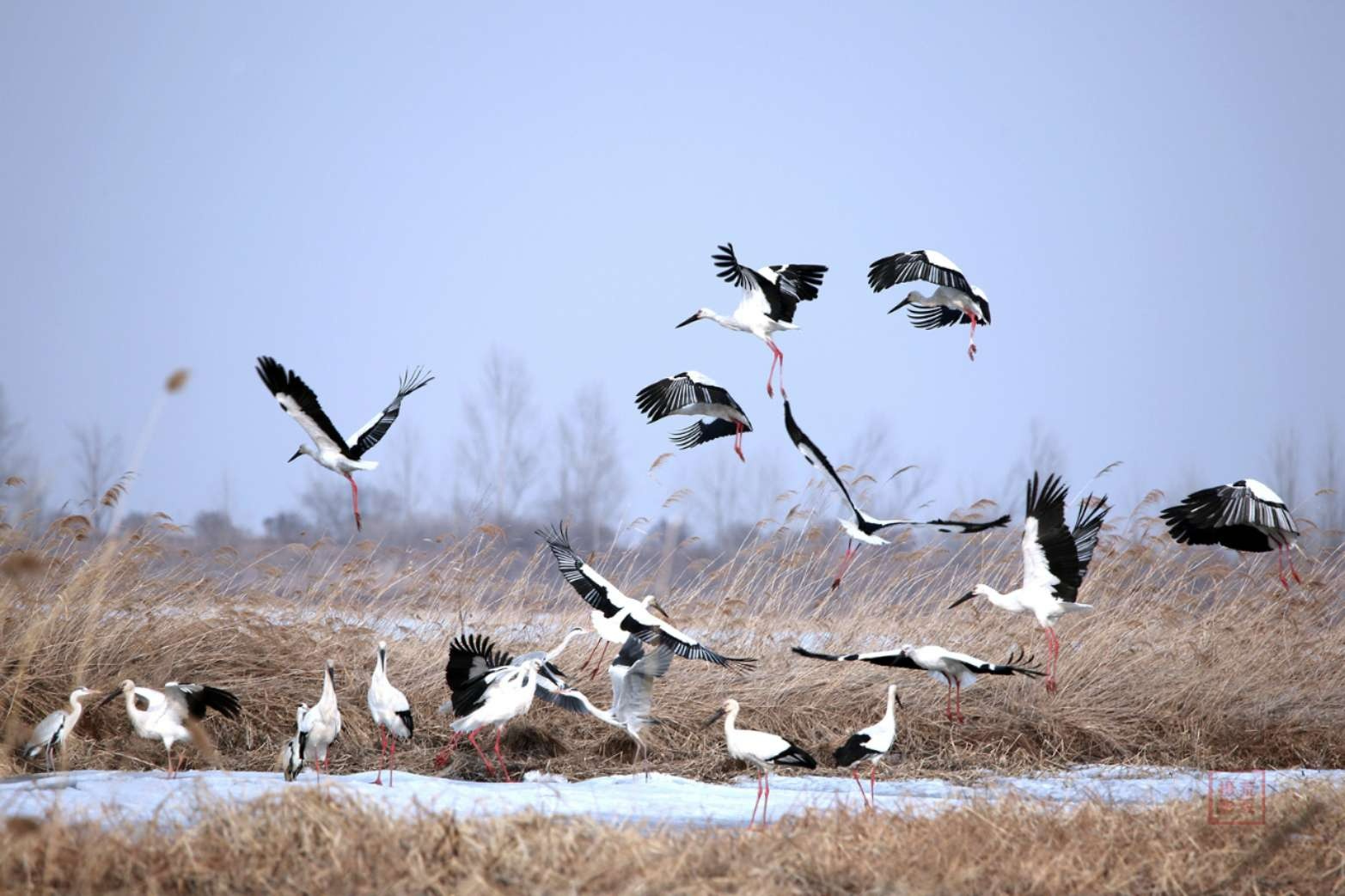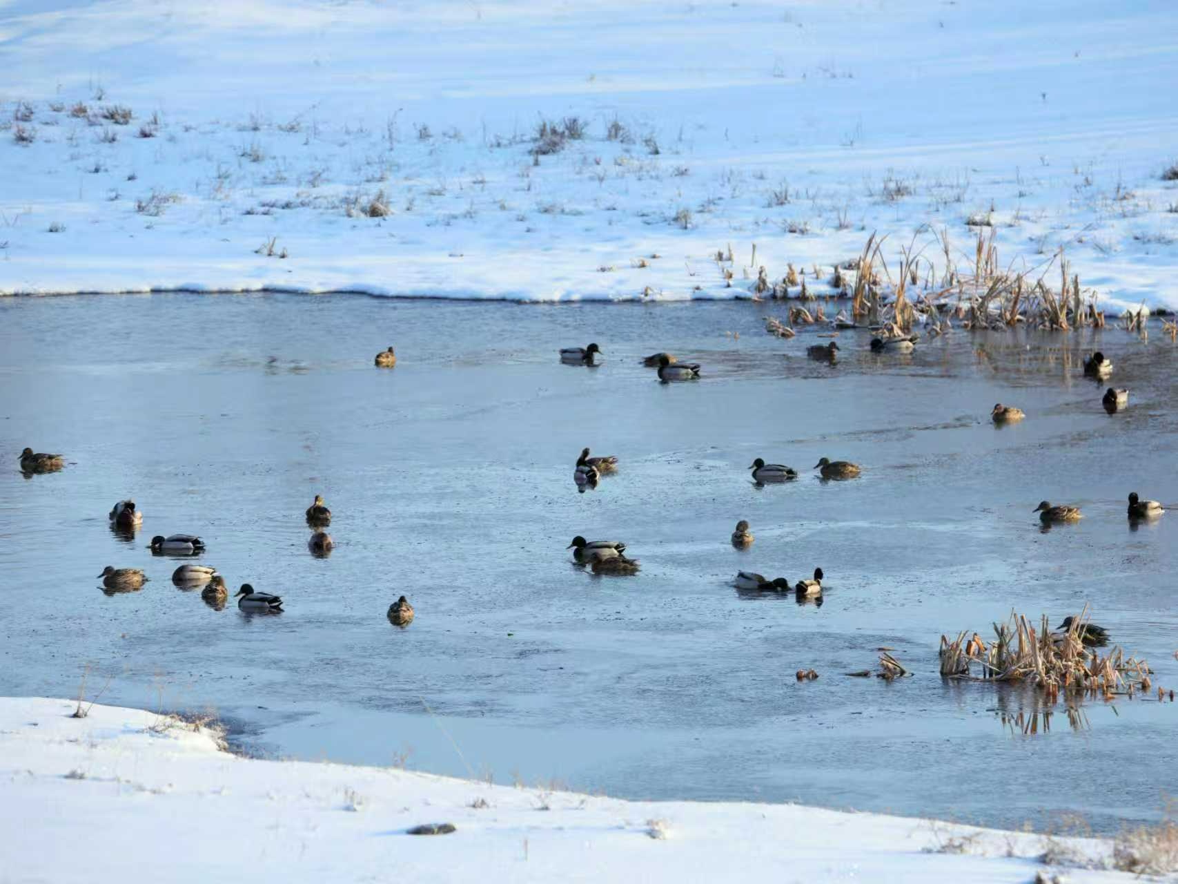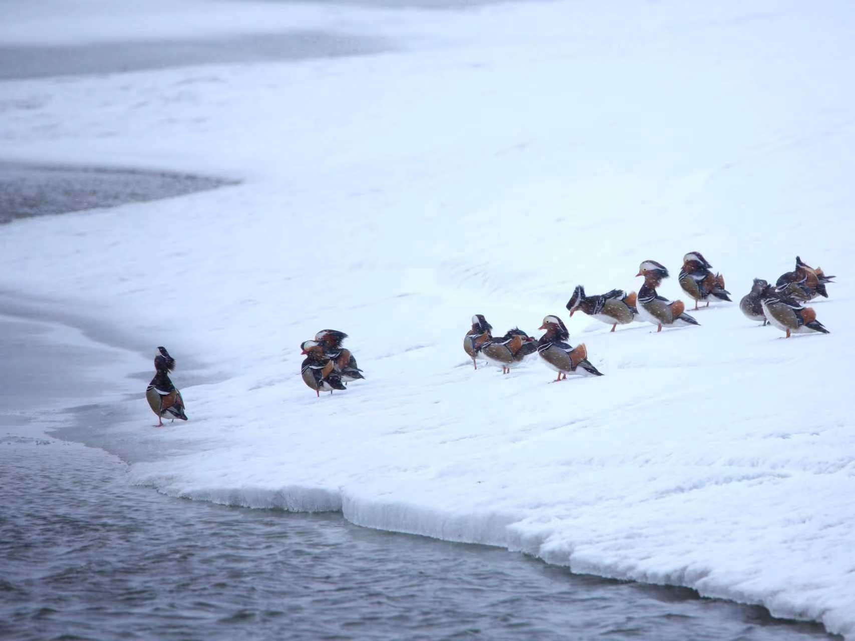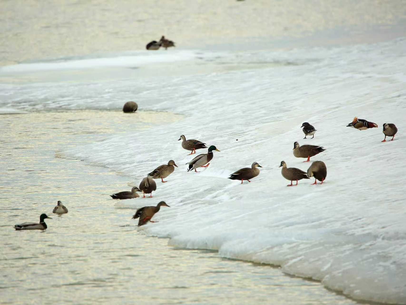 東方白鸛優(yōu)雅地立于冰緣,白尾海雕在空中盤旋巡視,鴛鴦成雙成對地嬉戲,大雁列隊掠過天際,鸕鶿扎進水中覓食,還有各種鴨類——綠頭、赤麻、針尾……它們在水面上,打鬧、追逐、鳴叫、求偶。