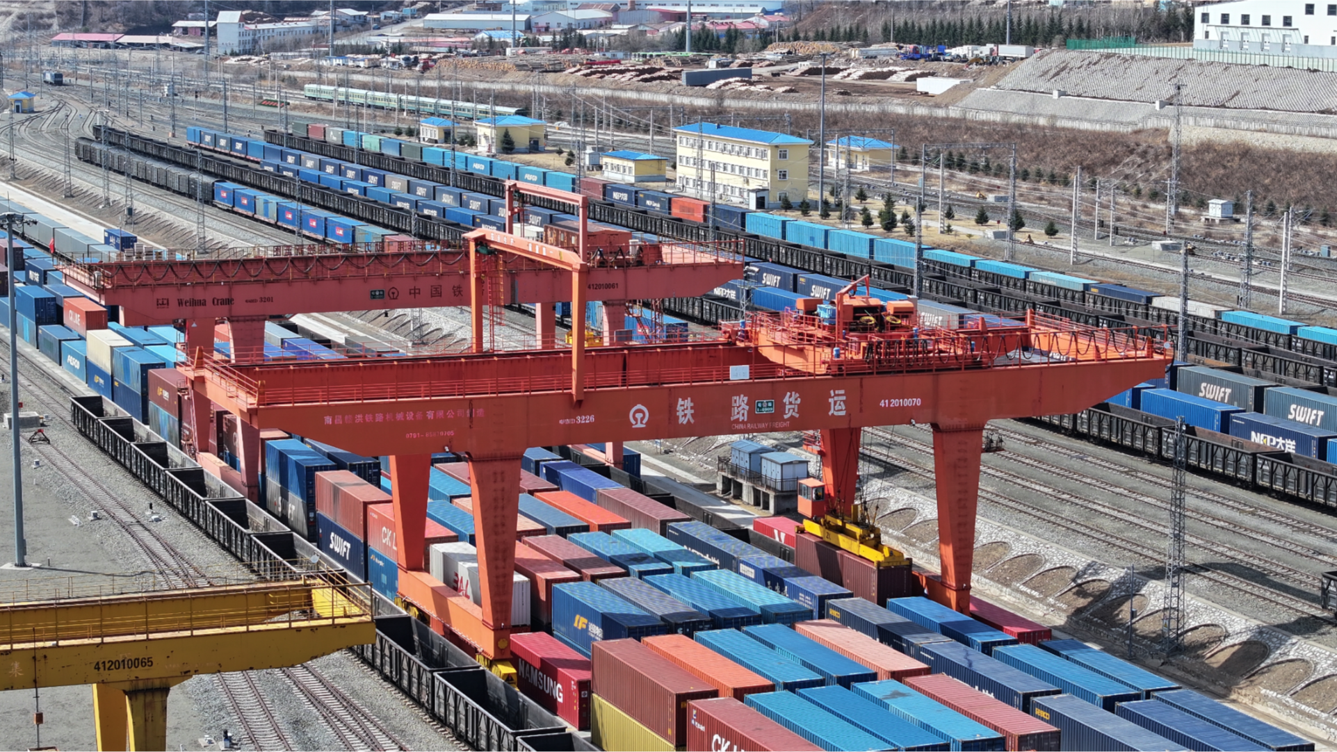 4月14日,滿洲里鐵路口岸國(guó)際集裝箱場(chǎng)6臺(tái)龍門吊全負(fù)荷運(yùn)轉(zhuǎn),對(duì)一列編組55輛滿載化肥、汽車配件、食用油的回程中歐班列進(jìn)行裝卸作業(yè)。