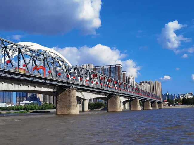 央廣網(wǎng)哈爾濱6月24日消息(記者馬俊瑋 實(shí)習(xí)生刁晨陽)近日,位于哈爾濱松花江畔的濱洲鐵路橋成為最紅“打卡地”,它是哈爾濱的第一座跨江橋梁,自1901年落成至今,已有120年的歷史,人們親切地稱它為“老江橋”。為迎接建黨百年,該橋裝飾有400余面紅旗和“100周年”的標(biāo)識,記錄了中東鐵路的通車和各個(gè)時(shí)期的重大事件,橋與天空、江水相銜接,成為一道亮麗的風(fēng)景線。