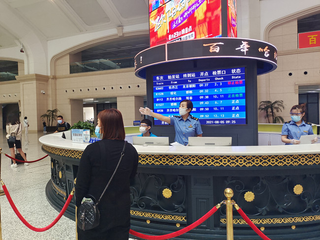 哈爾濱火車站咨詢臺工作人員做好防護(hù)為乘客解疑答惑。哈爾濱鐵路局 供圖