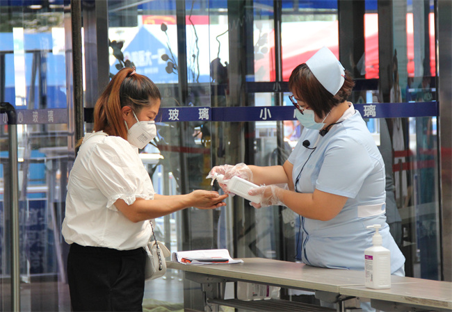 出入醫(yī)院人員洗手消毒后方可進(jìn)入樓內(nèi)候診。哈醫(yī)大一院 供圖