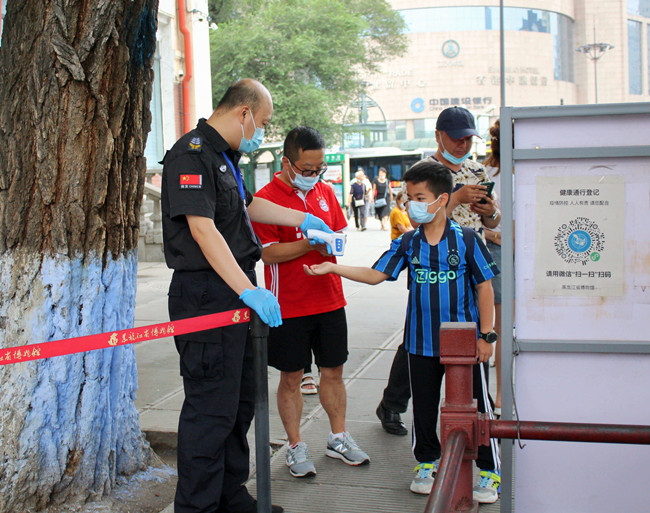 游客積極配合黑龍江省博物館工作人員掃碼測溫工作。汪頎偉 攝
