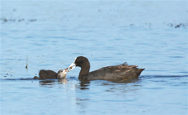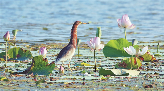 濕地中間,幾處遠離人群的荷塘中,大量須浮鷗不停地在覓食,帶回一條條小魚喂幼鳥寶寶。在葦叢與荷葉間,綠頭鴨、斑嘴鴨父母帶著幾個孩子,教它們認識食物。一片片荷葉,成為蒼鷺、池鷺、夜鷺、白鷺、黃葦鳽等鷺鳥的“購物平臺”,它們伸長脖子站在上面,等小魚游過時,伸脖出喙,一擊而中。