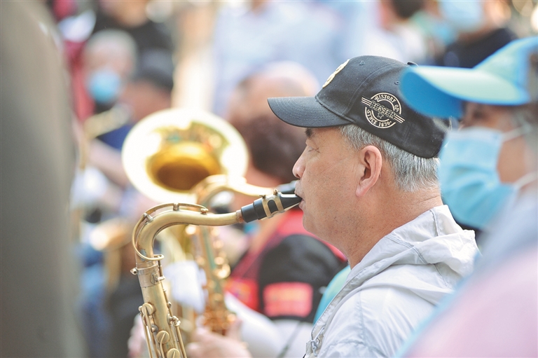 那邊,一個(gè)音箱、一個(gè)話筒,發(fā)燒友們輪流獻(xiàn)唱,不時(shí)地博得圍觀人群的陣陣掌聲。一些市民拿出手機(jī)拍下視頻,發(fā)到朋友圈。這邊,十幾個(gè)人組成了小樂隊(duì),有吹的、有拉的、有彈的,配合著合唱團(tuán)一起表演。“沒有共產(chǎn)黨就沒有新中國(guó)”、“紅梅贊”等一首首經(jīng)典歌曲的旋律久久在江畔回蕩。